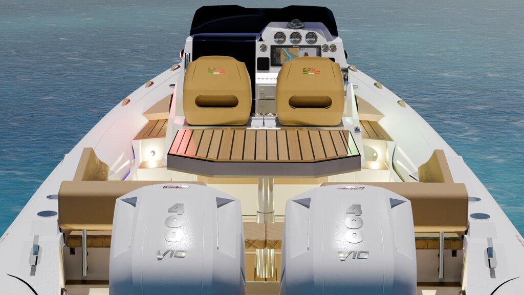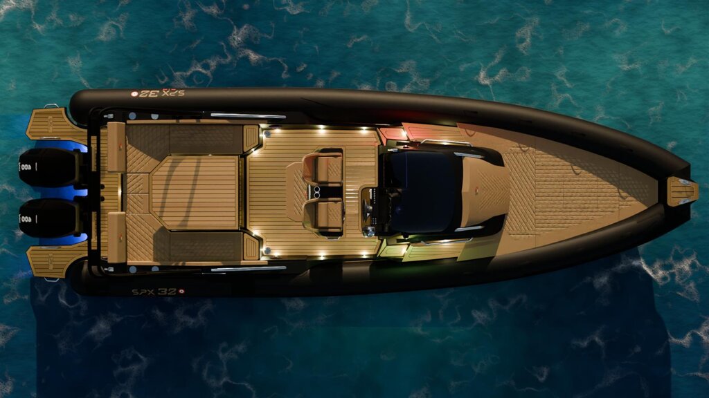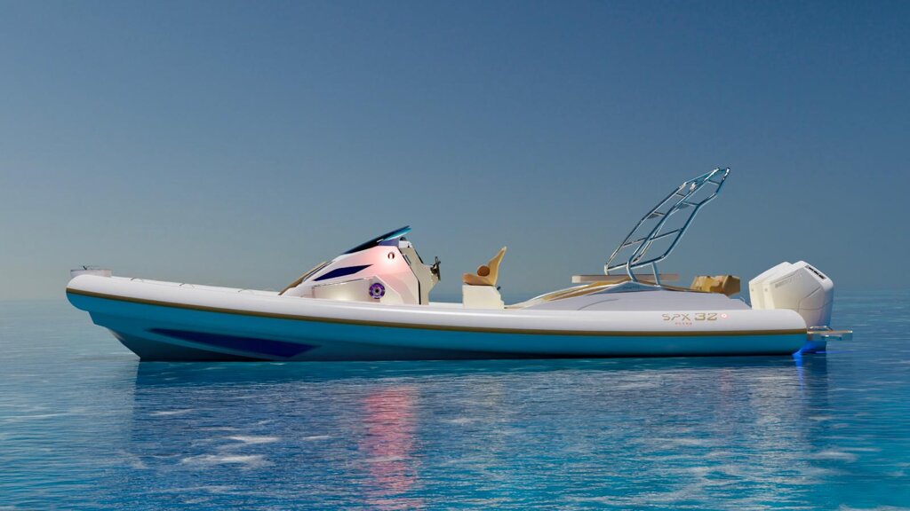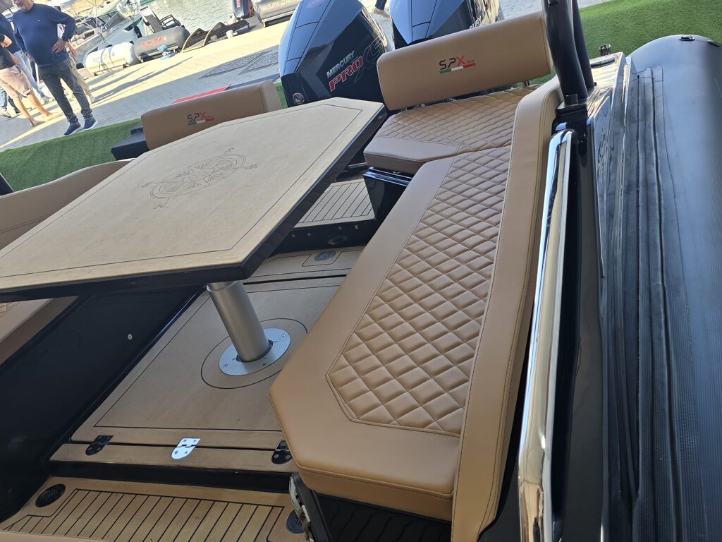 Il gommone Spx Rib 32 Dinette, lungo fuori tutto 9,95 mt. e largo 3,40 mt., omologato CE in cat. B, può trasportare fino a 16 passeggeri. Con dei divanetti lateriali, con possibilità di aggiunta di un tavolo. Oltre a questa scelta puoi far diventare un unica zona di prendisole.